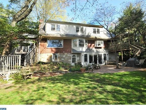 Jenkintown Manor Colonial that is nestled among towering trees & lovely gardens.Enter down winding slate path to this brick/wood-sided colonial w/a versatile & cozy floor plan.Large Sunny LR w/gas fireplace & picture window.Great Room w/arched windows,french doors to deck and hardwood floors.Elegant DR with bay window,hw floors and crown moulding.Kitchen boasts white cabinets,solid surface counters,newer appliances,garden window,hw floors,breakfast room w/skylights, french door to deck and spiral staircase to loft/office.1st floor boasts a library/home office plus private Bedroom w/half bath.The upper level delivers a neutral Master Bedroom w/updated en-suite bath and 2 closets (1 w/i) Lg.2nd BR w/an abundance of closets and a door to loft.Bright 3rd BR and hall bath complete this level.Lower level has large finished great/play room with wall of french doors leading to brick patio and private yard, laundry room and storage areas. Close to Alvelthorpe Park,Jenkintown Train Station,shopping, dining and schools.