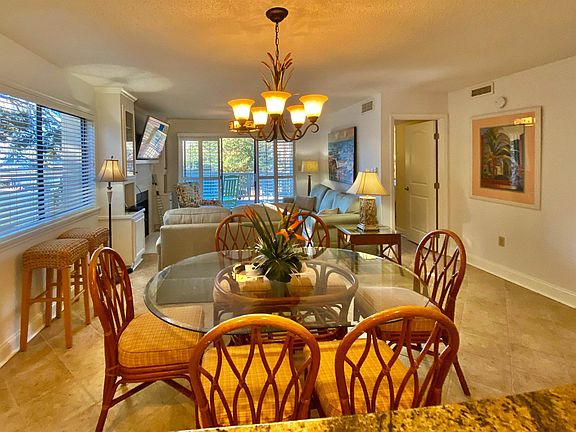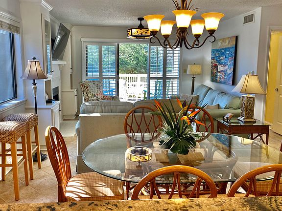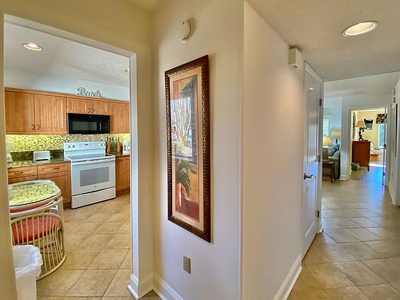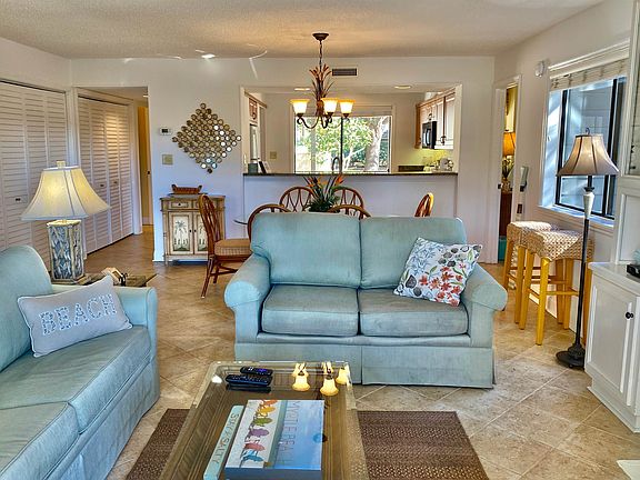 Nicely updated three bedroom, 2 bath villa in Richmond Park on the lake. Enjoy great lake views and the community pool that is just steps from this villa. The ocean is only a 5 minute scenic walk across the lake. The living room, dining room, kitchen, foyer and hall bath have contiguous beige tile. The bedroom has luxury vinyl wood look flooring that coordinates well with the tile. The kitchen has wood look cabinetry and upscale granite. The living room has custom cabinetry surrounding the fireplace and there are plantation shutters on the living room sliders. All of the TVs have been updated and are wall mounted with electricity and cable installed behind the TVs. The master has a king bed with balcony access and a private bath with double vanity, double closet and linen closet. The second bedroom has two queen beds with private access to the hall bath and the third bedroom has two twin beds. Furniture, artwork, bedding and flooring are all coordinated to give a designer look. This property is great for a second home, rental or primary residence.