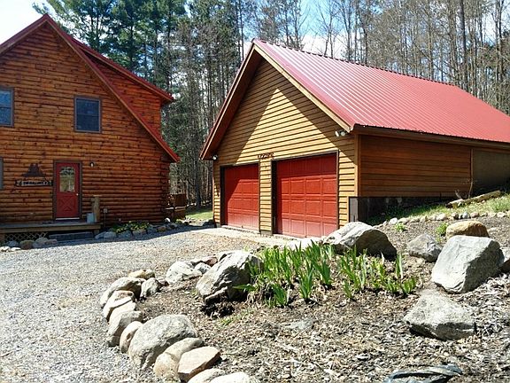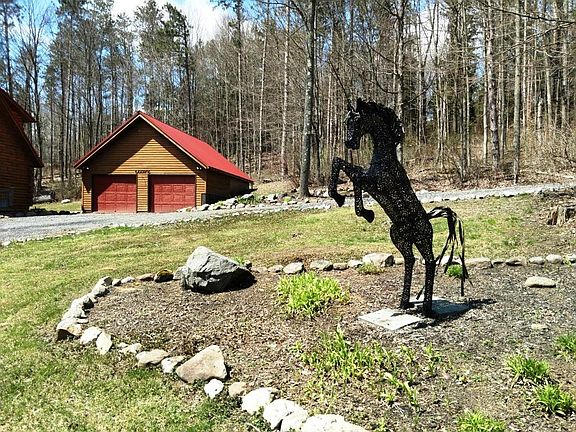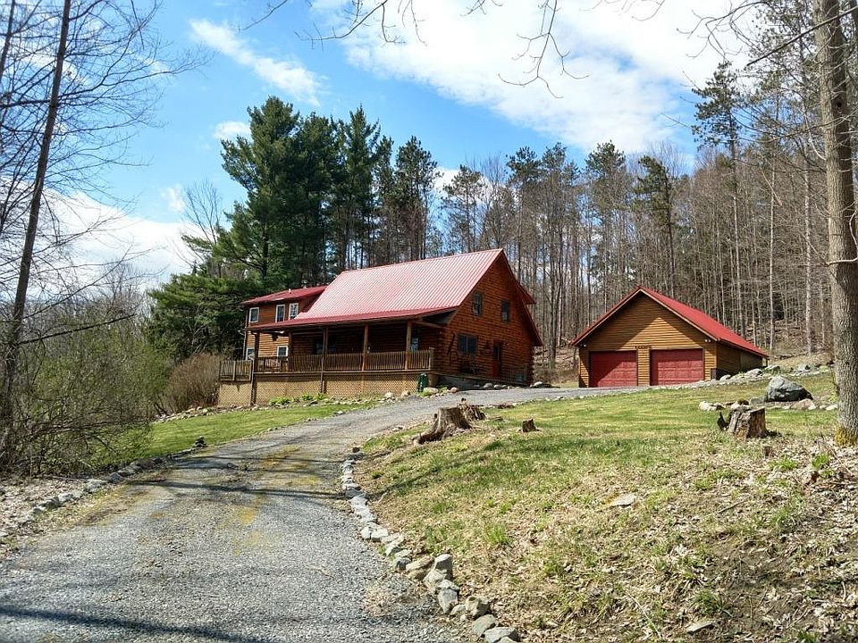 This well maintained Log Home on nearly 10 acres is your ultimate escape to the Country! Large open floor plan with Kitchen, Living room, Dining room combo. French doors out to back deck. Separate bright and sunny family room with in ceiling lighting, gas fireplace, and exit onto wrap around deck. Beautiful long distance mountain views from rocking chair front porch and side deck! Super efficient heating with Co-Op Electric. Very well built home featuring FOUR bedrooms, three up and one down. Upstairs Master Bedroom features walk in closet with built ins, large tiled bathroom with skylights and large soaking tub. Separate shared and tastefully appointed bathroom upstairs. Full bathroom downstairs with laundry. Beautiful remodeled kitchen with hardwood cabinetry, stainless appliances and granite counter tops. Attractive wood & laminate floors throughout. Wrap around deck overlooking nicely landscaped yard with stone pavers and perennial gardens. Partially finished and heated basement. Nearly TEN ACRES of nicely wooded land for HUNTING, hiking or other recreational pursuits. Store all your toys in a detached TWO STORY garage accessed from the circular driveway. Home is located on a QUIET dead end road minutes from the Village of Sherburne or Hamilton. There is nothing not to like here!