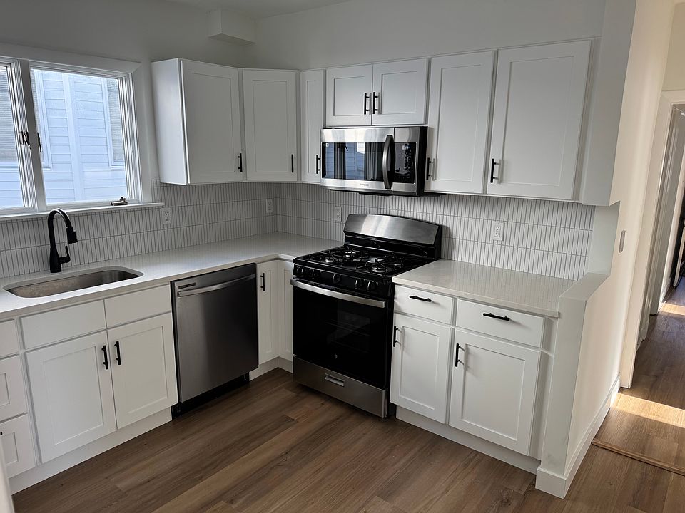 Bright and spacious kitchen with stainless steel appliances, gas stove, and modern countertops