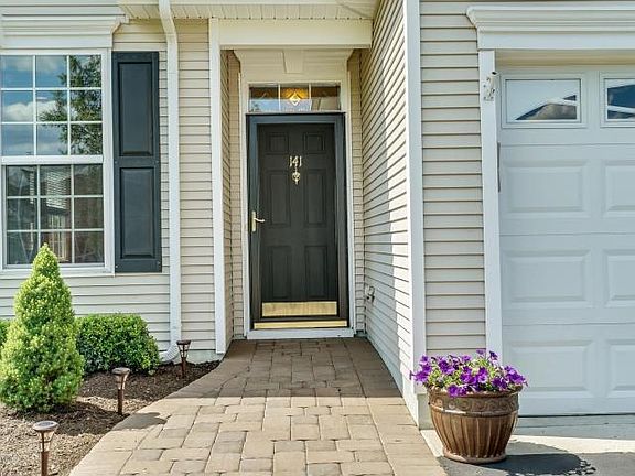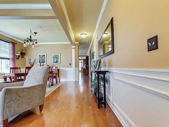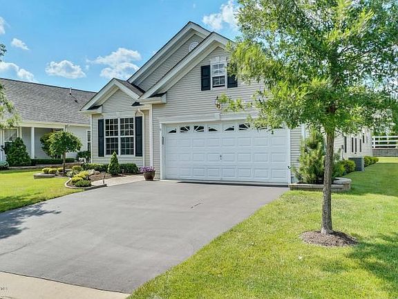 Located in the desirable Four Seasons @ South Knolls, a truly active adult community, is this beautiful Burnham model. A paver walkway leads you to the front door of this gorgeous home. Upon entry you are greeted by gleaming maple hardwood floors that run throughout all living areas, and beautiful trim work. The living room/dining room is adorned with beautiful crown molding and wainscoting with recessed lighting in the living room. The spacious gourmet kitchen features granite counters, stainless steel appliances, cooktop with double oven, recessed lighting, a large center island, and a breakfast area with bay window. Truly a perfect kitchen to entertain guests. Two beautiful columns lead you into the spacious family room which features more recessed lighting and crown molding.