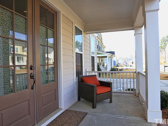 Beautiful home in Woodcreek with the best amenities in the Triangle. Beautiful iron/glass/wood barn doors in the entry closing off the study/ 4th bedroom. 3rd floor walk-up attic storage/ work-out area. 2 story covered front porches, screened porch and huge 2-tiered patio/ firepit in semi-private wooded backyard. Epoxy surface garage floor treatment. 5/20 warranty transferable from builder. House built with an extra large bonus. Whole 1st floor hardwoods. 2 walk-in closets in master. Gym does not convey