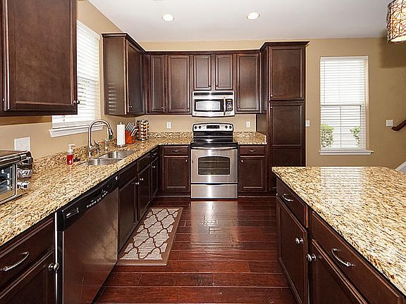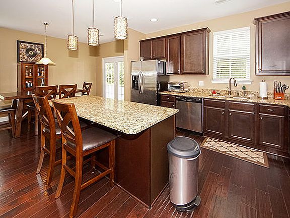 Spacious open floor plan with 9 foot ceilings. Living room has surround sound prewires perfect for those movie nights! You find elegant, dark hardwood floors in the living room, kitchen and master bedroom. Gourmet kitchen has granite counter tops, large center island, and stainless steel appliances. Huge master bedroom suite with tray ceilings, separate seating area, and tiled shower. Laundry room includes a washer and dryer for your convenience. Neighborhood boasts a pool and is close to a recreation center with indoor basketball courts and tennis courts.