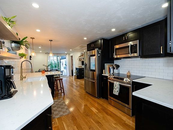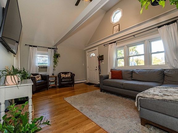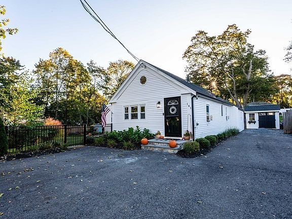 This is truly a hidden gem offering one-level living with a modern theme throughout. The open-concept kitchen/dining area boasts SS appliances, sleek black cabinets, quartz counters, subway tile backsplash and a pantry. The stylish bathroom features a custom reclaimed wood vanity and a spa style shower w/a marble bench. The inviting living room has a cathedral ceiling and a flexible floor plan allows for 2/3 bedrooms. Hardwood floors grace the main living areas. Set back from the street this home offers a private oasis. Slider off the kitchen leads to a backyard paradise featuring an outdoor kitchen w/a pizza oven, Jenn Air grill and fridge. The large, fully fenced yard w/a custom patio and fire pit is perfect for gatherings. 2 large sheds offer ample storage. Many updates throughout including new paint, new roof, cedar clapboard siding in 2021, appliances 2020, W/D 2023. Additional storage in attic/basement. Desirable location close to restaurants, schools, highway, commuter rail.