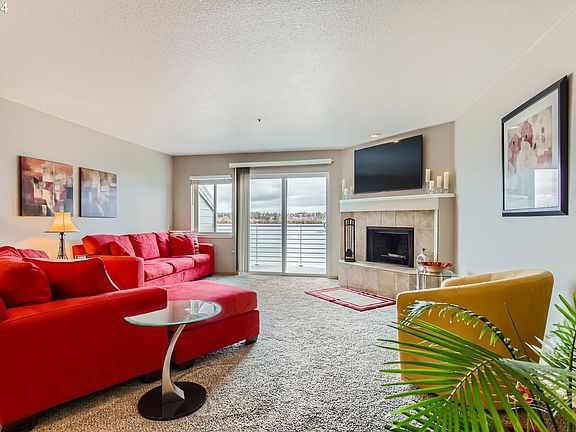 Best unit for sale! 180 Degree views of the River and mountains. Update 1 level unit with great room, fireplace and deck (with storage!). Updates include new carpet and pad, bright kitchen with tile and laminate floors. Primary bedroom has large walk-in closet. Assigned and deeded garage space #102. Assessments are all paid. Commons include new Recreation room, Spa, gym, pool, sauna. Lighted pathways to shops, cafes, boat slips.