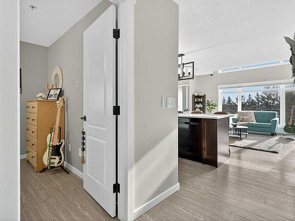 Experience exceptional condominium living in this incredible multi-level residence at 141 Mountain Street—one of the largest layouts in the entire building. Set in a quiet corner on the south side of the building, this unique unit comes with two titled parking stalls and offers an impressive level of privacy and natural light. Vaulted ceilings and massive windows draw your eyes to a view to Cochrane, while the expansive wrap-around balcony provides a relaxing spot to enjoy a hint of the mountains. The main level features a bright, open design that is perfect for both everyday living and entertaining. Fresh paint and meticulous upkeep make the space feel warm and welcoming. The well-appointed kitchen includes plentiful cabinetry, generous counter space, and a quartz island, ideal for prepping meals or gatherings with friends or family. A spacious dining area flows easily into the inviting living room, complete with a beautifully tiled gas fireplace. This level also includes a comfortable second bedroom, a 4-piece bathroom, and convenient in-suite laundry. Upstairs, the loft-style primary suite offers a peaceful escape with room for large furniture, a walk-through closet with exceptional storage, and a private 4-piece ensuite with dual quartz vanities. Recent upgrades include: New Kitchen cabinets, remodelled island, quartz counter-tops, all new appliances (incl. washer & dryer), new tile in foyer, kitchen backsplash, fireplace surround and both bathrooms (floors & tub/shower), fireplace mantle, paint (walls, doors, trim & ceiling), new sinks, faucets & toilets, light fixtures, custom blinds, new door hardware and even a custom built pantry. A unique advantage of this unit is dual elevator access—allowing you to reach your home from either the third or fourth floor. The heated parkade includes your two titled stalls, plus additional accessible and visitor parking for added convenience. Just steps from downtown Cochrane’s shops, restaurants, and amenities, this location also provides simple access to Calgary and the mountains via Crowchild Trail, Highway 1, and the nearby Tuscany C-Train station.
