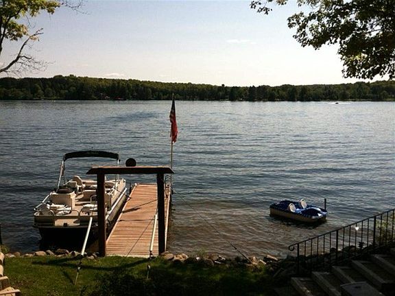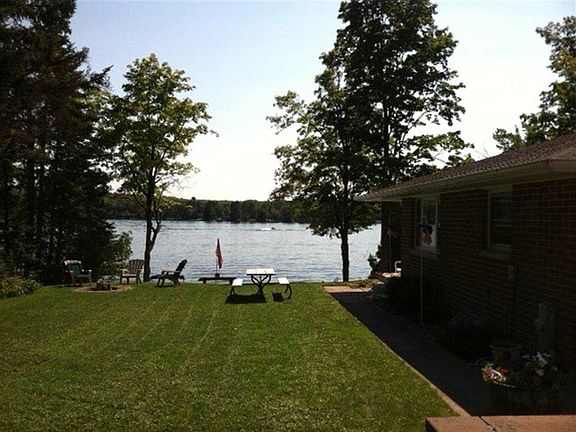 Well built 3 BD, 2 BA brick home on a very scenic Sunset lake parcel with 100'+/- frontage! One floor living with many great lake views. Custom stone gas fireplace for those chilly evenings. Professionally done lakefront walkway and landscaping. All sand beach frontage. Large solid boat dock. Recent improvements are a new roof, maple cabinets and flooring throughout. This is a very well cared for home with an especially scenic lake parcel. The three car attached garage has plenty of room for all your toys. Move right in and start enjoying what lake living is all about.