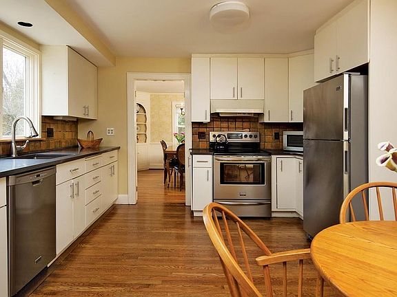 Wonderful Waban. Meticulously maintained 8 room, 4 BR, 3.5 bath Colonial filled with charm and character. The living room with fireplace and built-in shelving leads to a dining room with chair rail and built-in corner cabinet. The eat-in kitchen has recently been updated with stainless steel appliances and new quartz Silestone countertops. A laundry room/mudroom abuts the kitchen. The 2nd floor offers 3 bedrooms, a full bathroom, and an office with built-in bookcases and an open stairway to the 3rd floor master suite--a fabulous retreat! The bedroom features cathedral ceilings, rafters, and skylight. There's a master bathroom and generous closet space. The lower level has been improved with a playroom (@ 1981) with a fireplace and a full bathroom. Front steps and railing were replaced in 2017. The back yard goes back to Amherst Road. Conveniently located to shops, public transp., and major routes.