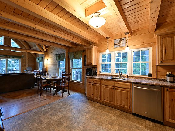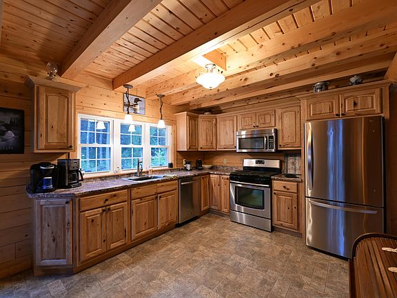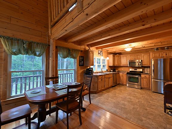 Maine lakefront log home for sale in Lakeville, Maine. The first floor features and open concept entryway, kitchen, dining, and living room. Also on the first floor is a bedroom and a full bathroom with laundry. The second floor has a large bedroom, office, and full bathroom. There is a 2 car detached garage with storage above and a garden shed. Enjoy all of the amenities, power, private well & septic, and year round access. This home sites on 13+/- acres of land with 350+/- feet of frontage on Duck Lake. Duck Lake is part of a large chain of lakes with navigable waters all the way to West Grand and the Grand Lake Stream area.