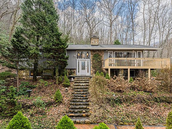 Beautiful Mid-Century Modern nestled deep in the cool rhododendrons of Buckeye Cove. Nearly 4 acres of extremely private wooded mountain land where you can leave the windows open at night and hear only the sounds of nature and the babbling brook. Newer systems and appliances throughout. All tile floors including additional large sunroom (not included in sqft). Wonderful brick pathways and stacked stone accents. Winter views! 10 minutes to Tunnel Rd shopping and 12 minutes to Downtown Asheville. Currently a full functioning short term rental home with great rental history! Buyer can negotiate to purchase fully furnished and stocked.