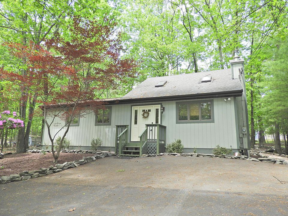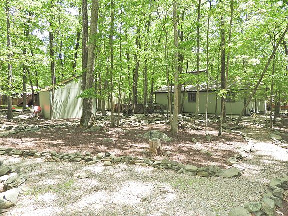 This UNIQUE 3 BR/2BA Contemporary Ranch is turn key ready, fully furnished & equipped w/ everything you need. Well maintained & freshly painted. Great Room has vaulted ceilings w/ skylights & a beautiful soap stone, wood burning stove to heat the entire home along w/ a mini-spit AC to cool it. Ceiling fans in GR & in Master BR w/ custom walk-in closet & updated en suite. Eat-in kitchen has plenty of cabinets & counter space along w/ stainless steel appliances. Full size washer/dryer & plenty of closet space & a walkup floored attic. Outside the fire pit, Weber grill & large deck are surrounded by hard-scaped maintenance free landscaping on a flat wooded lot, sizable shed & 5 car paved driveway. Low taxes & HOA in this amenity packed community. Your mountain retreat awaits!''
