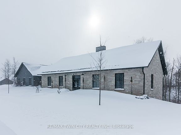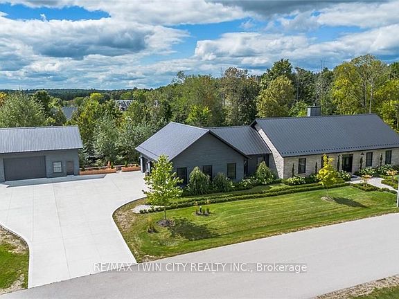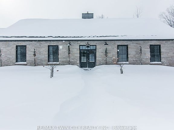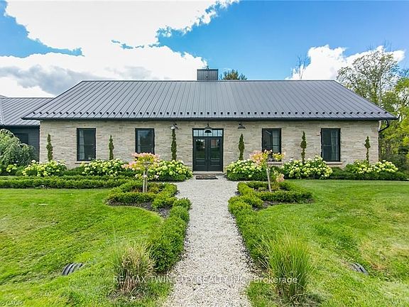 Spectacular Custom-Built Bungalow with Walk-out Basement, Triple Car Garage & Detached 2-Storey Garage & Shop on Two Acres-just 35-45 min from Waterloo! Nestled in an exclusive enclave of executive homes in Moorefield, this property offers a peaceful country setting with easy city access. Built like no other, it showcases structurally superior ICF (insulated concrete form) construction & a lifetime metal roof-the same quality extends to the det garage. Inside, the open-concept layout features exposed timber-frame details, soaring vaulted ceilings & 2 glass garage doors that open onto a 3-season porch.The kitchen, dining & living area impress w/ a stone f/p, concrete counters, oversized island & fantastic walk-in pantry w/ floor-to-ceiling storage. At its heart: an 8-burner Wolf gas stove, double ovens & upgraded range hood-over $40,000 in luxury appliances! Entertain year-round w/ the screened porch, complete w/ outdoor kitchen, brick hearth & fume hood for your bbq. The main floor also boasts a stunning primary suite w/ walk-in closet, spacious dressing rm & spa-inspired ensuite. A 2nd bedroom, currently an office, offers lovely treed views. A stylish mudrm, laundry rm & powder rm w/ live-edge barn door complete the main level. The fin w/o basement features heated floors, 2 bedrooms, 4-pc bath & expansive rec spaces-perfect for family gatherings or games night. 2 more w/o garage doors lead to the backyard & patio. For hobbyists, the 3-car gar is wired for an EV, while the sep insulated 2 storey wrkshp w/ electrical & wood stove provides endless options for projects, vehicles or gym. The nearly 2-acre property incl a pool-sized lot, new tiered deck, firepit area, treehouse & almost an acre of forest w/ a creek running through it. Your own private retreat!