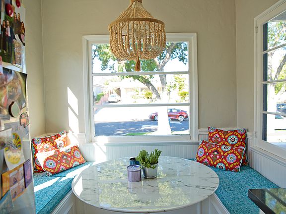 Enter through an outside lounge area and into a beautiful an open floor plan with exposed beams, quartz countertops, a custom breakfast nook, beautiful dark wood floors, and indoor/outdoor living at its best.