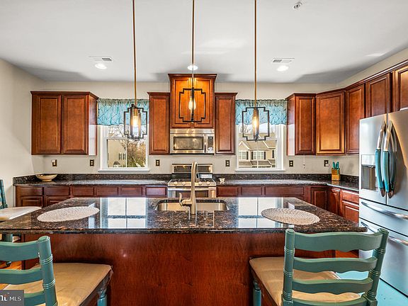Welcome to your charming stone-front townhome in Saddlebrook Estates. This tri-level home has 3 bedrooms, 2.5 bathrooms and a 2-car garage. The main floor is perfect for entertaining family and friends. The kitchen has granite countertops, 42-inch cabinets, a double oven, all stainless steel appliances such as Whirlpool microwave, 2-year-old Frigidaire fridge, a pantry, and a spacious 8 ft island with bar seating. Off of the kitchen, you'll find one big space, living room, and quiet deck that onlooks the backyard. The main floor is laid with beautiful hardwood floors. Upstairs, you'll find the 3 bedrooms and laundry closet with full load washer and dryer and ceiling fans accompanied by carpeted floors in immaculate shape. To the left the spacious primary bathroom awaits with en suite bathroom and walk-in closet. It is large enough for a vanity space and all your needs. The 2nd full bathroom is at the top of the stairs, and the 2 other bedrooms are nice sizes and have large windows, closets, and ceiling fan power. The lower level first floor has a closet with a mechanical panel and sliding glass doors leading to the rear yard.