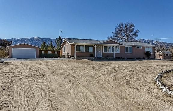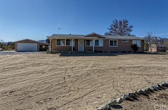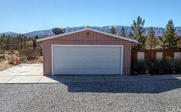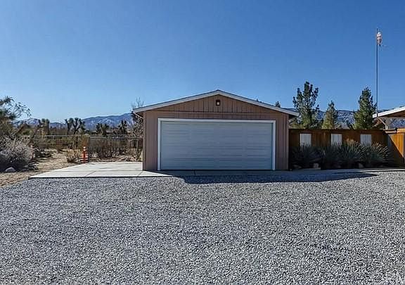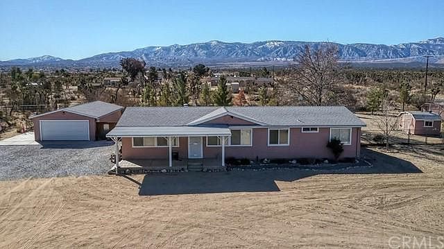 Peaceful Pinon Hills living! Welcome to this adorable 1620 sq ft home in a scenic and quiet area with spectacular views of Wrightwood mountains and El Mirage Dry Lake located on a paved corner. The brilliant split floorplan in this home includes separate living room and family room with pellet stove that is open to the peninsula kitchen. The primary suite has walk-in closet and separate garden tub and shower, the second bedroom is en-suite and there is a bonus room which can be used as an office or bedroom. The office has beautiful copper & wood coiffured ceiling, the living room has vaulted ceiling and is very roomy. It has a laundry room in the house off the kitchen with separate entrance. The lot is fully fenced, cross fenced and has a circular drive with 2 entry gates. The added value features in this home must be seen to be believed and the pride of ownership shows! The roof is new, new plumbing with Uponor Pex piping, front patio cover is new, all concrete is new, paint is new, propane tank is owned, fencing is new, there is a huge covered back patio AND the detached garage is a 4 car!!!