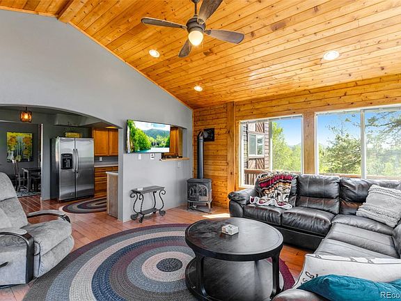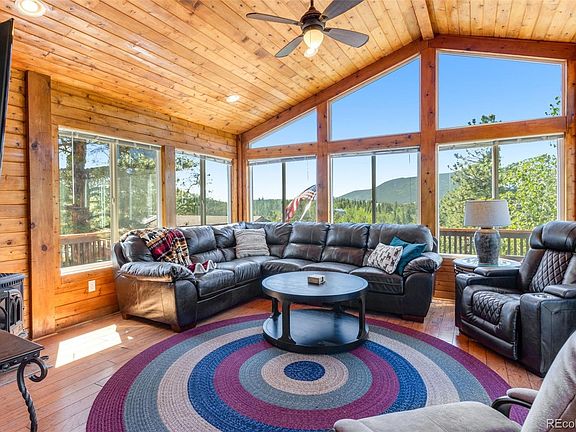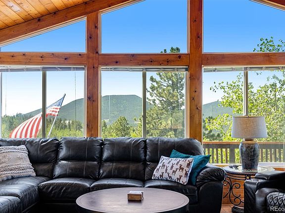 Welcome to this gorgeous home in Bailey, Colorado. Surrounded by multiple wilderness areas; fishing, hiking, biking and jeeping adventures await. Picture morning coffee or an evening beverage taking in the spectacular views of the mountains. Plenty of room to spread out with one bedroom and one bathroom on each level. Stunning vaulted ceilings bathe the main level in sunlight. Entertain on the main floor in the ample dining room with hickory hardwood floors, adjacent kitchen boasting double oven, solid surface counters, new dishwasher and stainless steel appliances. Just off the kitchen is the sunroom with mountain views from every seat and a gas stove to keep the space warm and cozy. The main level is finished off with a bedroom and large walk in closet as well as a spacious full bathroom with a jetted tub. The walkout basement has room for watching your favorite movie, getting a workout in, reading a book by the fire or even using it as a game room. A bedroom, large laundry room and full bathroom complete the walkout basement level. Upstairs there is a loft with incredible views and a juliet balcony. Bedroom with space for a king size bed, a walk in cedar closet with a hidden storage closet behind. The primary bathroom boasts a relaxing clawfoot tub to soak at the end of a long day. This home is situated on .8 acres with a wrap around porch, a covered patio and plenty of room to explore. The detached extra deep garage is large enough for two to three cars with ample space for storage or a workshop. Next to the garage is a finished shed with electricity and heat to be enjoyed as an office space, workshop space, studio and more. Often deer and other mountain animals can be seen on the property. It is located near the end of a cul-de-sac. The optional POA offers a stocked pond, horse corral and pasture, clubhouse, disc golf, ice skating and ice fishing. No need to bring in propane for this home as it's been upgraded to natural gas. Adventure and relaxation await!