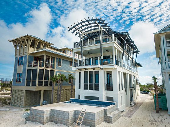 Must see new luxury custom built Gulf Front home located in Ovation on Cape San Blas with westerly view over the Gulf for spectacular nightly sunsets! Home abounds with pure luxury and amenities. Masterful architectural design with well-appointed furnishings and finishes. Private gulf front pool being completed now! Home features 5 Bedrooms w/private baths, and 2 additional half baths with elevator to access all floors. Kitchen features hand painted back splash tiles, Wolf 6 burner/griddle range, SubZero Refrigerator, Bosch and Fisher/Paykel Dishwashers. ICF house construction built on slab tied to 36 pilings drilled 30' into the ground. Curved Pergola on master suite deck is custom built with glue lam beams & cedar purlins. Interior features River Reclaimed & new Pecky Cypress throughout.