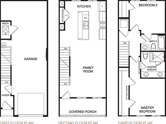 The Maxwell floorplan features open concept living on the middle floor with an oversized kitchen island and a covered porch. Chefs and entertainers alike will enjoy the spaciousness of the kitchen and connected family room, and the built-in kitchen pantry offers an abundance of storage. The top-floor offers a private owner's suite and bath with a secondary bedroom and bath for a roommate or guest. The first floor includes a private 2-car garage.