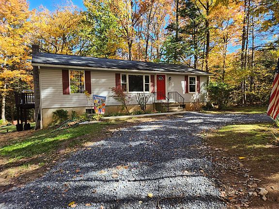 LEASE PENDING. Step into stylish serenity. Beautifully designed and fully renovated in December 2023 by an international award-winning graphic designer, this unique, cozy 3-bedroom, 2-bathroom home is privately nestled on a wooded 1.33-acre lot in the desirable Eldred Twp section of Kunkletown, PA. At that time, they put in all new modern amenities including a new GE oven. microwave, and dishwasher suite, new granite countertops & sink, new Frigidaire side-by-side refrigerator/freezer, plus a new family-sized LG washing machine and dryer. Plush wall-to-wall carpeting in the living room and all three bedrooms, complements the color-coordinated decorator quality paints and blinds throughout. Even both bathrooms had new floors, new toilets and new LED lighted mirrors installed as part of this total renovation. With plentiful parking for guests on the circular stone driveway, will you be the lucky new tenant who can enjoy winter evenings downstairs entertaining friends & family in your 600 sf western-themed rec room & bar? Or spend summer days above it all sunning privately on your elevated 400+ sf. rear deck? Lots of basement storage space, with room left over for a shop or home office. Given the quality and completeness of this recent renovation, small family pets will only be considered on a case-by-case basis. Please note, applicants must pass a credit and background check to apply. The landlord is offering a one or two-year lease, with options for additional years. First month's rent plus one month's security required at signing. Reasonably priced at only $2075 per month, we don't expect this lovely listing to last very long. Interest has been VERY HIGH, so now that we have a date to begin scheduling tours, be sure to reserve your appointment to visit TODAY. Renter pays all Utilities