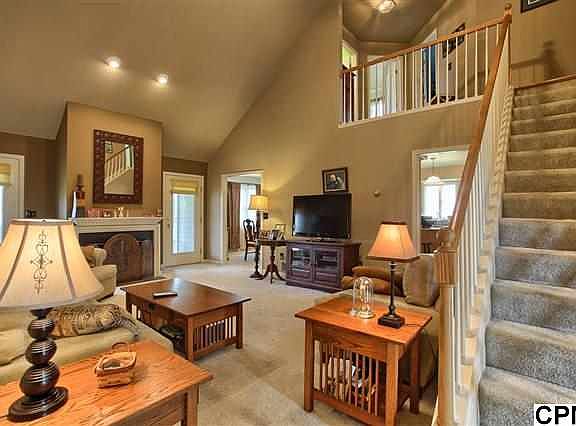 Totally surprising floor plan! Massive living room with 17' high vaulted ceilings, second floor balcony and gas fireplace. Spacious country kitchen with new quartz counters, center island and beautiful glass tile backsplash and a formal dining room. First floor master suite with loft which can be used as office, master bath with soaking tub, double bowl sinks, huge finished basement, enclosed porch, composite deck and much more!