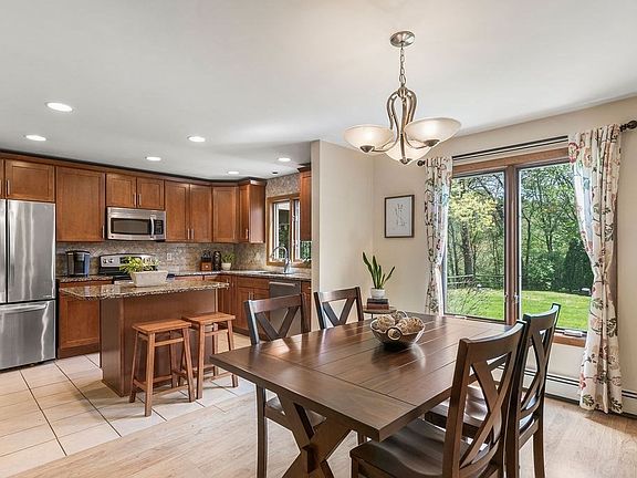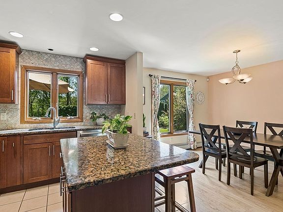 Newly listed, Well maintained contemporary set on almost 2.50 acres with picturesque views. This home has 3-4 Bedrooms, primary bedroom has a large slider to a veranda overlooking beautiful mature landscaping, fruit trees, vineyard, and garden, 2.5 baths, family room with cozy wood stove and a large slider to deck, living room has skylights and vaulted ceiling. the front has elegant stone work and new energy efficient doors on garage. The basement is partially finished with a 4th bedroom or office and has a bonus room can be used as a playroom or another living room, ample storage area,4 zone baseboard heating, 20 minutes to Providence and walking distance to Crestwood Country Club.*See firm remarks*