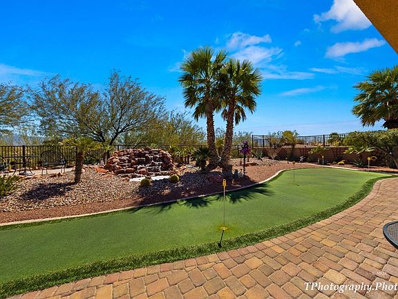 This impressive Joshua is located in the only gated neighborhood in Sun City Mesquite. On nearly a quarter acre, including 3,075 square feet on the interior, the exterior is truly a back yard Oasis. This fully walled-in back yard shares both privacy & stunning mountain views. The landscaping is distinctive as the outdoor spaces were thoughtfully designed boasting a tranquil water feature, oversized putting green and extended paver walks. Offering three bedroom suites, 3.5 bathrooms, spacious game room/den/office and open living areas, this popular plan has appreciated space. Three separate but well appointed bedroom suites make this home unique. Cherry Cider cabinetry accent the kitchen and costly granite covers the counter tops. Double ovens and pull out shelving in the cabinets are upgraded. A casual breakfast nook shares the sites of the morning sun in the back yard while a more sophisticated dining choice is located in the front of the home capturing the sunsets over the mesa. Better than great, the laundry room is lined with cabinetry & has a large utility sink. The epoxied garage has space for three vehicles and/or golf cart and the additional storage options are awesome.