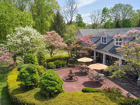 TWO HOMES ON 5 PRIVATE ACRES. With the same owners for almost 60 years, this is a rare opportunity to own a multi-residential estate in the heart of Bucks County. Perched on the Palisades overlooking the Delaware River valley, this lovingly maintained property features two unique homes: an elegant main house with three bedrooms and a whimsical mid-century modern guest house. The main residence has been renovated by its current owner to create a study in elegance, artfully blending the home’s old-world charm with a multitude of modern comforts. The Carrara slate tiled foyer connects the home’s three main living spaces. To the left is a state-of-the art kitchen with quartz countertops, generous custom cabinetry, and all newer stainless-steel appliances, including a commercial-sized side-by-side refrigerator, a wall-mounted KitchenAid dual oven and microwave/convection, an induction cooktop, a retractable kettle faucet, and a Miele cooktop grill. The spacious center island boasts a KitchenAid dishwasher, a wine fridge, a double-wide stainless-steel sink, and built-in wine shelving. To the left of the foyer is the light-filled living room, with a grand stone fireplace and a large picture window overlooking the courtyard. Joining the kitchen and living area is the spacious dining room with views of the back patio – ideal for outdoor dining and entertaining. Beyond the living room is the main-floor bedroom featuring another picture window to the courtyard, a sitting area, and a full bath with walk-in shower. Rounding out the first floor, there’s a flexible space that’s currently being used as a music room/bar, a powder room just off the main entrance, a walk-in pantry, a mudroom with access to the back yard, and a laundry room. Upstairs is the private parlor/library, featuring stunning views of the surrounding countryside, beautiful custom-built cabinetry and bookshelves, a decorative fireplace, and an adjacent wet bar. Down the hall is a cozy guest bedroom with built-in cabinetry, an office space, and a hall bath with shower/tub. The private principal wing includes another decorative fireplace, a sitting area, plenty of built-in cabinetry, a dressing room, and a recently renovated principal bath that’s a true retreat, with a glass walk-in shower, a dressing table, and two skylights for plenty of natural light. Moving back outside, a landscaped path leads to another building that includes an oversized two-car garage on one side and an unfinished two-level space on the other. Ideal for additional storage, this second “cottage” could easily be transformed into a separate home office, workshop, artist’s studio, or even extra living quarters. Finally, tucked away at the far end of the property is a delightful mid-century bungalow brimming with character and warmth. Whether used as a guest house, writer’s getaway, or rental home, this charming second residence offers privacy and comfort, with its own kitchen, spacious living area, bedroom and bath. The entire property is surrounded by nature (it’s just one mile to Ringing Rocks State Park and two miles to the Delaware River and Canal path), yet it's only minutes to all the eclectic shops and fine restaurants of Milford and Frenchtown and just an hour and 15 minutes’ drive to New York City. Don't miss this unique opportunity to own two homes in one exceptional setting!