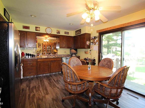 Rare find in city limits! This 1.2 acre lot surrounded by mature trees only one block from the high school. One level living with 3 bedrooms, one and a half baths, and laundry on the main floor. The master bedroom has a large double door that walks out to the deck; great for alot of natural light looking out to the large open backyard. The main floor full bath has a walk-in tub. Living room has a gas fireplace and large picture window and is partially open to the combined kitchen/dining room (stainless steel appliances and convection oven) that walks out to the deck that attaches to a fully finished gazebo with electric and a couple windows that have screens. Or you can enjoy the larger gazebo that overlooks a small creek running through the back of the lot. Full finished basement has 2 bedrooms, 3/4 bath, office with large closet, family room with electric fireplace and a full kitchen with lots of pantry/storage. Storage shed in backyard is included. Gravel parking pad in back with electric close by is a great place to park your RV. The attached two car garage is insulated, shelving and cabinets for storage and has extra attic storage. This house has only had one owner who shows such great pride of ownership and has so many great features to enjoy!
