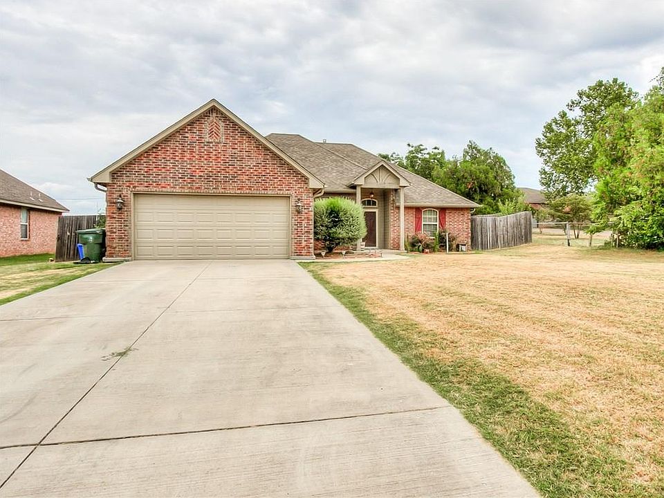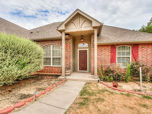 If you're wanting country living close to town this is it! Newer home that sits on a half acre lot in the Carl Albert School district. This open concept 3 bed, 2 bath home includes an office that is large enough to be a 4th bedroom. Sellers have updated the flooring in the living room and exterior guttering to name a few. Living room is super easy to arrange furniture and includes a gas fireplace perfect for those cold winter nights. The kitchen features custom cabinets, gas stove, breakfast bar, and granite countertops. Master suite includes walk-in closet, jetted tub, double sinks, and wood framed mirrors. The laundry room is large and has many cabinets for storage and a sink. The backyard is fully fenced with a privacy fence. The backyard includes a large in-ground storm shelter and a covered patio. The play set stays. Your kids will love playing outside on this property!