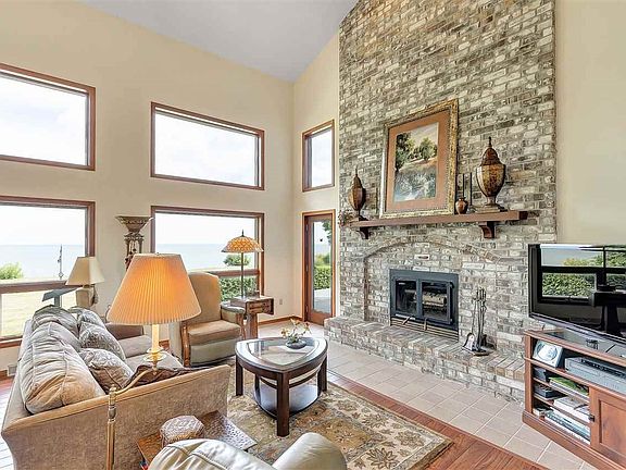 Lake Michigan waterfront bluff home offers spectacular panoramic views of the Lake, with stunning Kewaunee Pierhead Light sunrises! You will absolutely love the magnificent 2 story foyer w/catwalk and wall of windows to the Lake upon entry to this beautiful home. Property has 214' of frontage set on 1.92 acres (p/assr). Spacious 1st floor master suite with patio doors to the deck beckons a leisurely morning coffee. Vaulted ceilings in living room boast an amazing floor to ceiling masonry fireplace. Upper level offers 2 additional bedrooms and full bath. Hurry, this one will not last long!