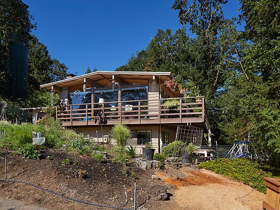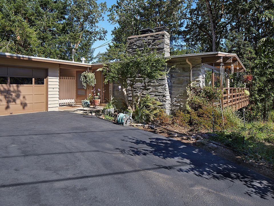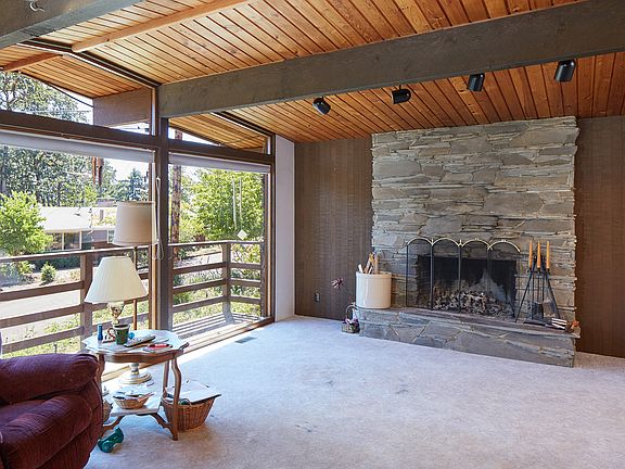 Accepted Offer with Contingencies. Stylish Mid-Century Modern Style on a sunny yet forested .33 acre corner lot. If you like open wood beam ceilings you will love this one. Spectacular stacked slate fireplace and wall of windows draw you in. Beautiful real maple floors through much of main level. Decks everywhere, newly expanded master suite with more of those wood ceilings. A real garden spot in the woods!