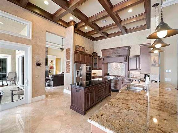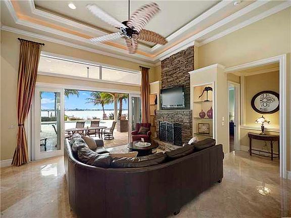 Built in 2009, this sultry wide waterfront home delivers resort-style living with luxe bespoke finishes. Soaring triple tray ceilings, rich millwork, and gleaming marble floors. Grand Master Suite features dedicated office and separate bathroom suites - one side has a stone tub, the other offers a cedar-lined sauna and shower. Chef's kitchen, with six burner gas stove, is open to living and entertaining area. Impact windows and doors, whole home generator, and security system makes this a sensible choice. Outside, enjoy the expansive covered patio, summer kitchen, pool and spa, gas-fed fire pit, and five-hole putting green. Dock, with lift, finished in composite decking and offers access to deep water and Downtown by boat.