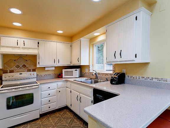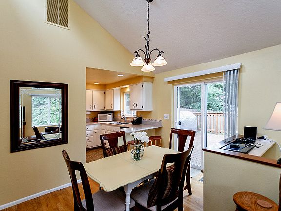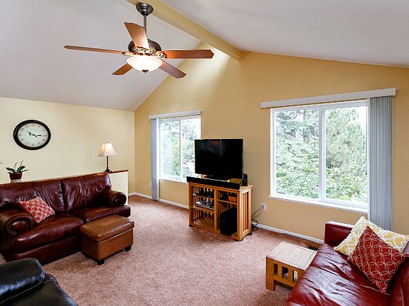 Privacy and views abound! A gated driveway leads from the cul de sac to an oasis in the trees. Vaulted ceilings, newer windows, huge deck, patio and lawn area. Enjoy views of the city and hills. Silestone counters in kitchen, Master Suite with bath, office nook, his & hers closets (hers is a walk-in!), & access to patio. 4th bedroom can be Family Room and has full bath. Newer electrical panel and heat pump with warranty and service.