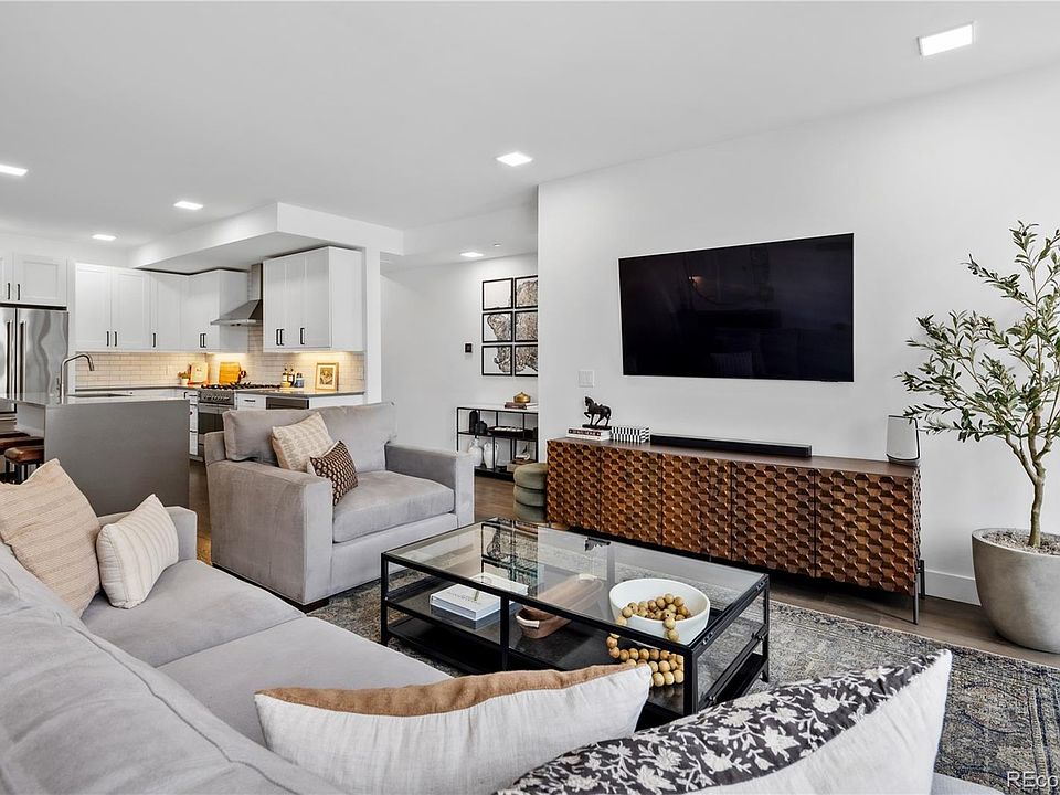 Experience an effortless and comfortable lifestyle within this 3-bedroom, 3-bath Denver townhome in the vibrant LoHi neighborhood! Enter a stunning 2,060 sq ft interior where high-end modern finishes are on show, from the crisp white palette complemented by wide-plank flooring to the high ceilings adorned with recessed lighting. Large picture windows spill brilliant sunlight across the open-concept living areas, creating a lively atmosphere for entertaining. Whip up signature dishes with the kitchen’s top-notch stainless steel appliances while your guests sit at the prep island or adjacent dining nook. With gorgeous shaker-style cabinetry, matching chevron tile backsplash, a pantry, and sleek quartz countertops, it truly is an inspiring culinary space.