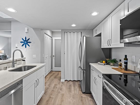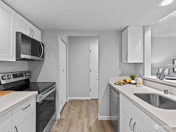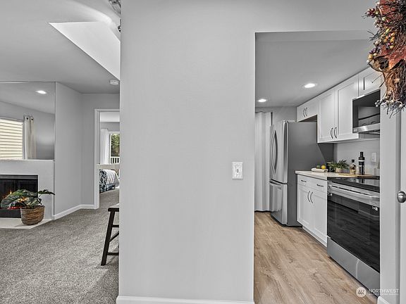 Located just West of Walter Hall, this 2nd floor corner condo has been thoughtfully remodeled and has no upstairs neighbor! As you enter the home you're greeted by warm natural light, and on the right is your all-new kitchen featuring soft close cabinets and shiny quartz countertops. An elegant quartz wood burning fireplace is the centerpiece of your impressive living room, perfect for those upcoming Autumn days and nights. Continuing into the spacious bedroom is your perfect retreat, you’ll have access to the deck and a walk-through closet into the oversized bathroom. With no rental cap this home is a fantastic investment and includes garage parking, low HOA dues, and easy access to Boeing, HWY 99, I-5, and many amenities. Welcome home!