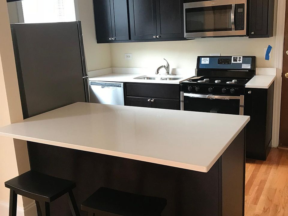 Deluxe Two Bedroom Renovation Lakeview/Southport Corridor New kitchen with stainless steel appliances, white quartz counter-tops and dark cherry cabinets. Island bar for casual eating. New bath with walk-in shower and new horizontal porcelain tile. Hardwood floors, ceiling fans, decorative fireplace, high ceilings, large closet in each bedroom with adjustable shelving. Two cozy bedrooms with room for full beds. Central heat and air conditioning, laundry in building and storage locker. Great location at Irving and Southport. Walk to Wrigley, train/bus, shopping, restaurants, bars, lake, and park. Non-smoking building and apartment. $1,495/month Move in Fee, No Security Deposit.