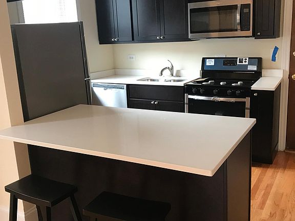 Deluxe Two Bedroom Renovation Lakeview/Southport Corridor New kitchen with stainless steel appliances, white quartz counter-tops and dark cherry cabinets. Island bar for casual eating. New bath with walk-in shower and new horizontal porcelain tile. Hardwood floors, ceiling fans, decorative fireplace, high ceilings, large closet in each bedroom with adjustable shelving. Two cozy bedrooms with room for full beds. Central heat and air conditioning, laundry in building and storage locker. Great location at Irving and Southport. Walk to Wrigley, train/bus, shopping, restaurants, bars, lake, and park. Non-smoking building and apartment. Non-smoking building and apartment. $1,495/month $350 Move in Fee Per Person, No Security Deposit. Available Now