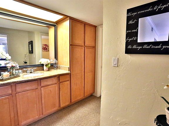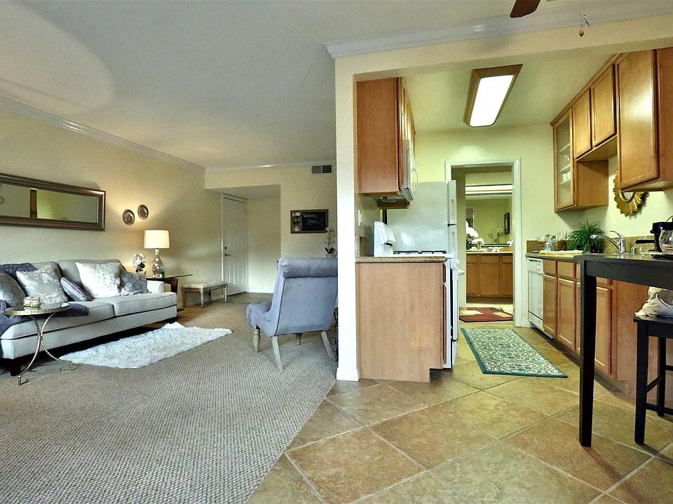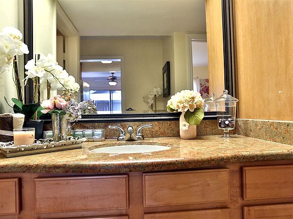 One bedroom, one bath. Very nice unfurnished upstairs unit with balcony. Gated complex. Grounds offer lush green landscape and four pools, built-in BBQs and relaxing entertainment areas. Condo features granite counters, tile floors in kitchen. Bedroom can accommodate a king size bed. Large walk-in closet. Spacious living room with new carpet. Bathroom includes new tub. Includes assigned carport, and laundry room. Unit has refrigerator, microwave, stove and central air and heat. Owner pays water, gas, trash and HOA fees. Tenant pays electric and cable. NO PETS ALLOWED. Near to post office, stores, banks, eateries, theatres, gym and golf course. $2,345 per month plus security and cleaning. Available approximately February 15. Excellent credit required. Furniture and decor in photos are for illustration purposes only and are not included.