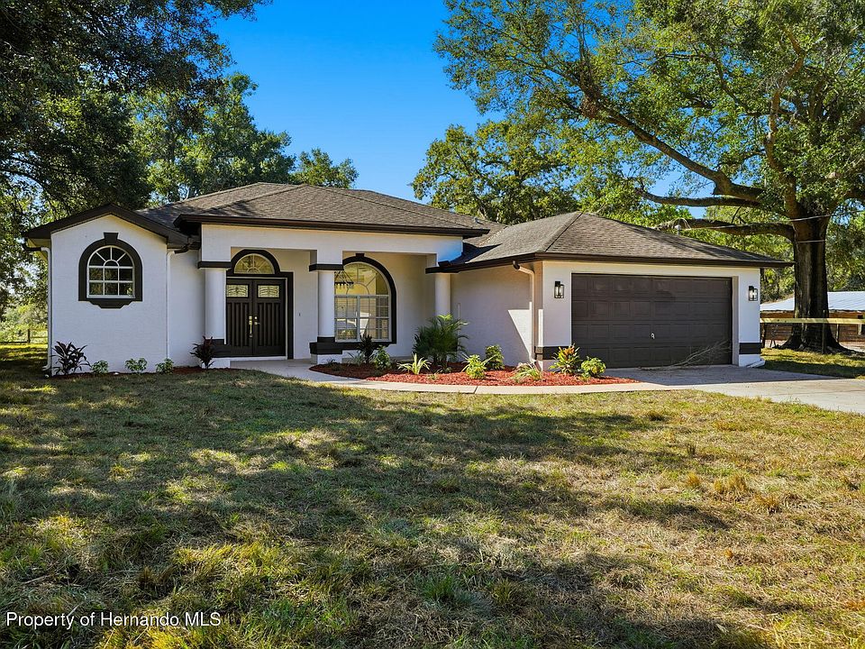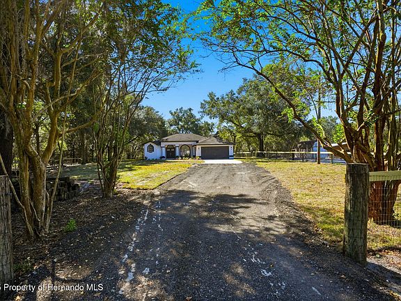Experience the perfect blend of country living and modern comfort in this beautifully remodeled 3-bedroom, 2-bath, 2-car garage home situated on 10 acres zoned Agricultural. Located near the Suncoast Parkway, this property offers both convenience and tranquility in one of Florida's main pigeon racing corridors—an ideal setting for enthusiasts or anyone seeking a peaceful rural lifestyle. The home has been tastefully updated with durable luxury vinyl plank and ceramic tile flooring throughout, new soft-close cabinetry, granite countertops, and stainless steel appliances. A brand-new HVAC system ensures year-round comfort. The spacious primary suite invites relaxation with a large garden tub, walk-in shower, and ample natural light. The property is fully equipped for livestock or equestrian use, featuring an 8-stall barn with power, cross-fencing, and six individual shaded paddocks. Additional features include a chicken coop and storage shed, providing plenty of space for tools, feed, and equipment. Enjoy the quiet of country life while staying close to major highways, shopping, and all the amenities of the Nature Coast. This move-in-ready property combines modern upgrades with agricultural versatility—perfect for those seeking space, comfort, and opportunity.
