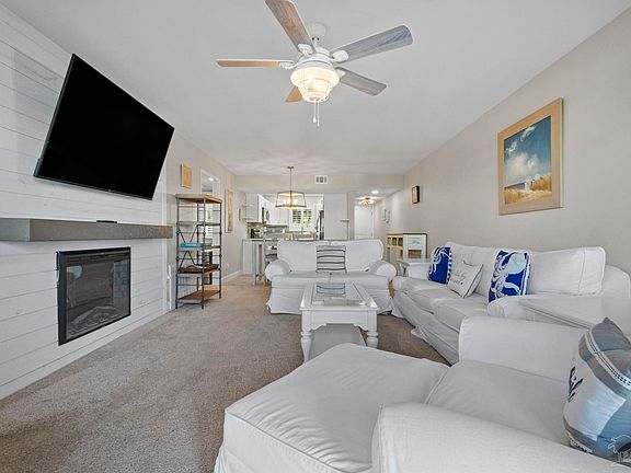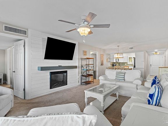 Stunning Waterfront 1st Floor Condo with Modern Updates and Coastal Charm - Welcome to this beautifully updated 2-bedroom, 2-bathroom waterfront condo, offering a perfect blend of modern luxury and coastal living. Located on the first floor, this condo boasts a private balcony with walk-out stairs that lead directly to the lawn—ideal for pet owners and those who enjoy easy access to nature and outdoor activities. Completely renovated and fully furnished with tasteful coastal decor, this condo is move-in ready. The open concept living area features a striking electric fireplace with shiplap surround, creating a warm and inviting atmosphere for relaxation. The kitchen showcases stainless steel appliances, sleek white shaker soft-close cabinetry, and stunning quartz countertops. A brand new stove ensures a top-of-the-line cooking experience. Both bathrooms have been updated with new vanities, offering a fresh, contemporary look. Plantation shutters add a touch of elegance to the kitchen and bedrooms, providing both privacy and style. Notable upgrades include all-new impact windows and doors, providing peace of mind during stormy weather, as well as a brand-new water heater installed in March 2025. The HVAC system was replaced in 2022, ensuring year-round comfort with efficiency. This condo offers not only luxury and style but also convenience and functionality, making it the perfect place to call home. Don't miss your chance to experience waterfront living at its finest!