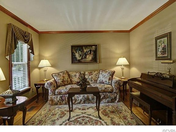 Don't miss the opportunity to call this beautifully maintained cape your new home! Nestled in a park-like setting, this property features hardwood flooring in foyer, dining/living room, stairs/upstairs hallway, and ALL bedrooms. Crown molding is located in the foyer, dining/living room, and family room (which also offers the added bonus of a gorgeous wood beamed ceiling). ALL baths have been remodeled with meticulous detail. Other updated items include a Trane heat pump, roof, security system, hot water heater, and stainless steel appliances. Exterior features include a full front porch with vinyl rails/trex decking, mature landscaping, and huge deck for entertaining. Enjoy the pool and tennis courts at the nearby Walthall Creek Recreation Association, as well as the added convenience of being located with 20 minutes to downtown Richmond, Ft. Lee, Southside Regional Medical Center, and VCU.