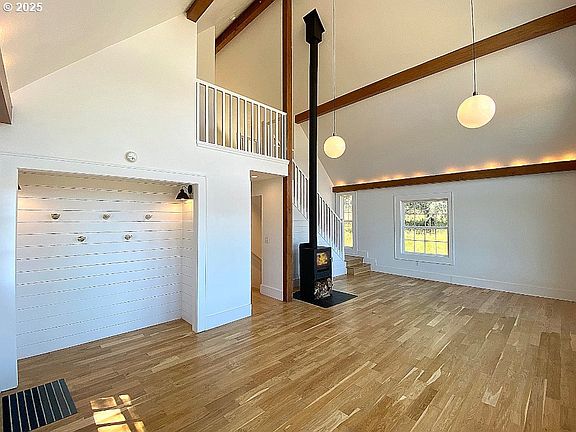 Lovely chalet-style home on 10 acres. Only 10 minutes from town. Large living area has vaulted ceilings that gives a sense of space. New efficient fireplace. The kitchen opens onto the back deck. A full bathroom with claw foot tub and a bedroom complete the main floor. Upstairs is a loft with en-suite bathroom and closet/dressing. Daylight basement has a large family room, another full bathroom, bedroom, and utility room. Large barn, new metal roof (home/barn), cement siding, well, septic tank.