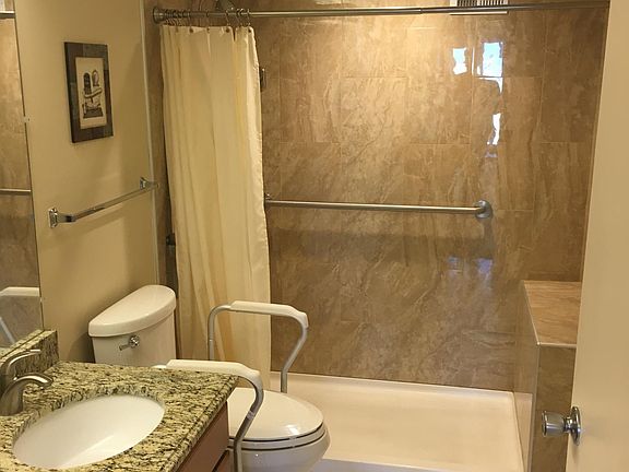 55+ community, 6th-floor apartment, two bed, one bath, enclosed balcony, recently remodeled kitchen and bath. Great view with morning sun. Heat, hot water, Trash, grounds, golf course, recreation center, pool, washer/dryer, and underground parking for one vehicle included. Renter is responsible for electricity, cable, phone.