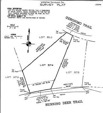 Ascending Running Deer Trail, a winding, hilly road, Lot 574, a nice, flat shelf, sits to the right. It extends through to Geronimo Trail, below view. Heavily treed about .2859 acre accordingly to TCAD. Frontage is on Running Deer, although it has a Geronimo Trail address. Homes in this areas are $400,000 and up. Only site built homes allowed. Septic needed.