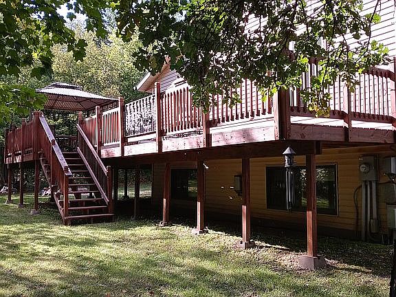 Split level home with open concept kitchen, dining & living room. Over-sized island for seating up to 7. Silestone Quarts countertops & Stainless Steel GE Appliances installed in (2020). Master bedroom w/ensuite master bath with 2 person spa tub w/stereo & oversized tile shower, dual sinks. Treated wrap around deck & ground level 14'x14' deck with 5 person hot tub. Attached double garage PLUS 40'X 30' metal detached bldg. w/electricity, cable and garage door opener. All of this on 2.01 ac. which gives privacy yet close to town. Shown by appointment only.