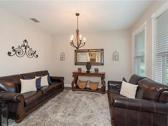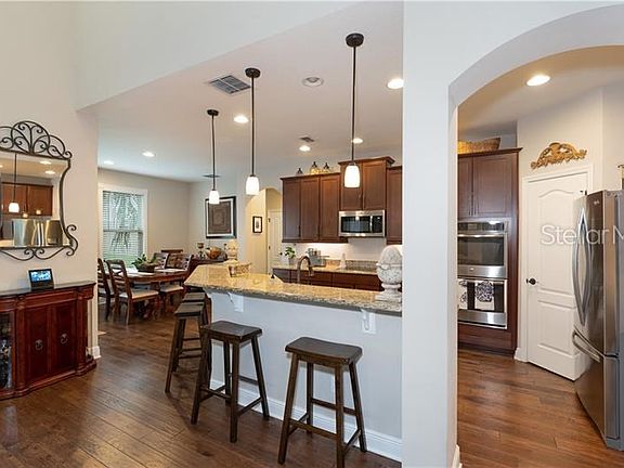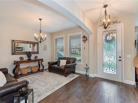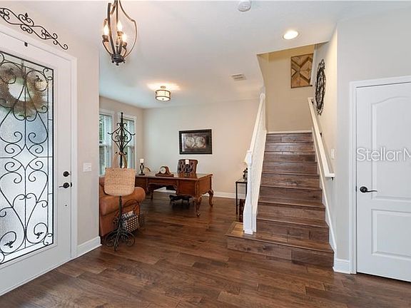 Sought after community of Orchard Hills! This gorgeous two story pool home features 4 bedrooms with 3.5 baths! Upon entering you will notice the soaring ceilings and the beautiful wood floors throughout the first floor and the staircase! There is a formal living room and office which can also be used as a formal dining room. The kitchen is amazing with the a large breakfast bar, tons of cabinets, spacious breakfast nook overlooking the pool and yard, walk in pantry and more. The family room features the two story high ceilings! Very open floor plan and great space for entertaining. You will notice the screened patio overlooking the resort style pool with a tropical feel. The water features in the pool and the swaying palm trees offer a relaxing backyard area. There is a privacy fence around the whole yard. The 3 car garage is a tandem garage and there is extra storage with the overhead storage units. Washer and dryer will stay. The exterior was recently painted and decorative brick front was added as well as gutters. Lots of upgrades! Great schools! Great location within minutes to the Winter Garden Shopping Village and restaurants with easy access to the highways.
