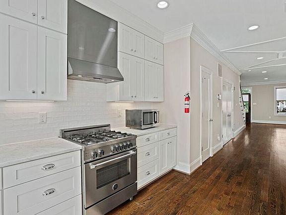 White countersOpen layoutSpacious kitchenGas stoveHardwood floorsStainless steel appliances