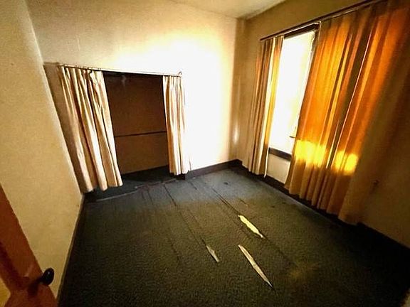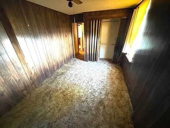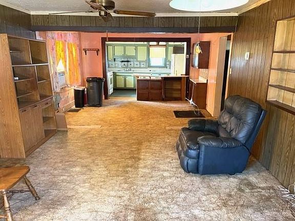 Living & Dining Room: Paneled walls, brown carpet, open concept. Kitchen: Painted cabinets, stove and refrigerator included. Snack bar separates kitchen from dining room. Bedroom: Large bedroom has paneled walls, brown carpet, closet. Bath: Tub and vanity, vinyl floor. Bedroom: Paneled walls, indoor/outdoor carpet, closet. Basement: Full block basement has two large closets, 100 amp breaker box, gas conversion furnace and gas water heater. Garage: 2 car plus garage with new garage door on front and another garage door on the alley with access there. Fenced yard.