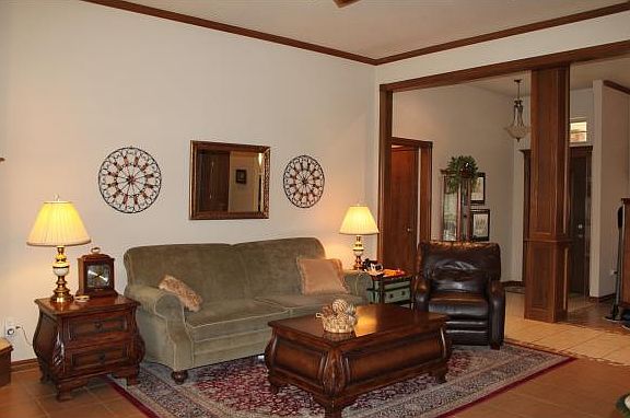 Jewel on NE edge of Blanchard. 1 ac. of peaceful, rolling hills. Turkey and deer roam through the well placed trees making for great views from the covered patio. Custom built with beautiful oak woodwork throughout. The kitchen is filled with cabinets; plenty of counter space and a new gas range. There is an eating bar as well as a sunny breakfast area off the kitchen. A fireplace in the living room is flanked by tall windows. Master bath has an enormous walk in closet and double sinks with jetted tub and separate shower. New carpet, hot water heater, faucets and newer AC, insulated garage doors and an outdoor storm shelter. Back yard in fenced in powder coated, black chain link with lots of beautiful flower beds and a 16 x 20 workshop with overhead door entry in back. Only 15 min. to Norman and 30 min. to OKC allows peaceful country living within minutes of anything you might need or want.