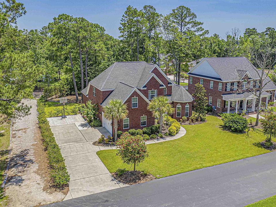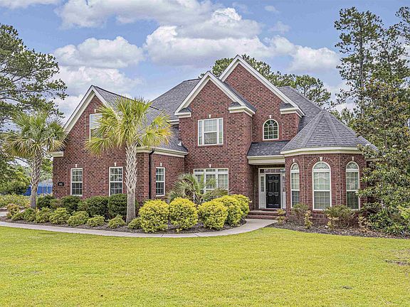 SPECTACULAR CUSTOM ALL BRICK HOME located in the exclusive gated PRESTWICK GOLF community. This impeccably designed 5BR/3BA home is ideal for gatherings and entertaining. The Queen Red Brick and dramatic roofline is an eye-catching standout. Enter into a welcoming two story great room graced with hand scraped hardwood floors, chandelier, elegant wood staircase with lighting & decorative iron spindles, ceiling fan and an inviting gas fireplace. A Chef's Kitchen features upgraded cabinetry, gorgeous granite countertops with large island, tumbled marble backsplash and spacious double door pantry. Stainless appliances include; Bosch dishwasher, double oven, gas stove, convection/conventional microwave, French Door refrigerator with double drawer freezer. There is also a Breakfast Nook with a convenient pass-through to the fabulous formal Dining Room accented with crown moldings, wainscoting and an elegant chandelier. Host your guests with ease in this open floor plan that effortlessly flows into a second Living Area/Office complete with built-ins and a second gas fireplace accessed off the kitchen. The amazing first floor Primary Suite is 21'x13', featuring a double trey boxed ceiling, 2 ample walk-in wardrobes, a built-in safe and spa-like ensuite with linen closet. The owners bath features lovely turned tile flooring, separate granite topped vanities, walk in shower, and jetted tub with water closet. A second 1st Floor Bedroom and full bath is located on the opposite side of the home which can work as a Mother-in-law bedroom. Sound insulation was installed in both 1st floor bedrooms. The spacious tiled laundry room will not disappoint offering a freestanding utility sink, turned tile floors and cabinetry. The second level offers 2 good sized bedrooms with closets, ceiling fans and carpet. The 5th bedroom features 20' x 12', two ceiling fans and a double closet. The well appointed bathroom upstairs features double vanity with granite counters, tub and shower combo and additional storage closet. There is a walk-up attic with a full size staircase and open ceiling joists' ideal for storage or future expansion. The garage features 4 foot extension, Rinnai gas hot water heater and high ceilings for plenty of storage. Control interior temperatures with ease and personal preference conveniently with 3 separate HVAC systems. The interior of the home is being painted a warm and light Natural Linen color. There are pretty gardenias adorning the back Screened Porch, hydrangeas around the pond and Japanese Ewes along the side of the home aiding in creating some buffered privacy. Irrigation system in place, too. Prestwick is a golfer's and tennis paradise with fun activities including resort style pool, clay and hard tennis courts, and a clubhouse you can rent for parties. Golf cart to the beach in minutes, visit the many boutiques or restaurants in nearby Market Common, plenty of shopping at the Coastal Grande Mall, and minutes to the Myrtle Beach International Airport. Location, upgrades and class delivers in this beautiful residence. Start enjoying the active coastal lifestyle now.
